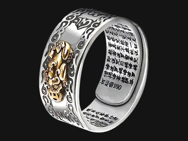 Este anillo no es solo una joya, es un símbolo de protección, prosperidad y equilibrio espiritual. Con grabados en sánscrito y una figura dorada de un León Guardián (Pixiu), representa una fusión perfecta entre arte, cultura y misticismo oriental